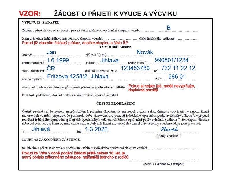 Žádost pak vyplníme a vytiskneme při kontaktní schůzce přímo v autoškole.